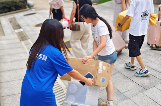 在去五号基地的路上,天桥两侧的志愿者会帮助新生搬运行李并指引至五号基地;五号基地的志愿者与天桥志愿者对接,解答新生及家长问题,同时完成新生与宿管的交接。