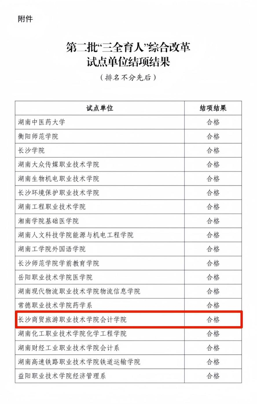 湖南教育新闻网讯(通讯员 胡思平 田爱萍)近日,中共湖南省委教育工委、湖南省教育厅公布了第二批“三全育人”综合改革试点单位项目结项结果。长沙商贸旅游职业技术学院会计金融学院作为试点院(系)顺利通过验收,标志着该院在构建“三维十径六导师”模式下的“三全育人”体系工作取得重要成果。